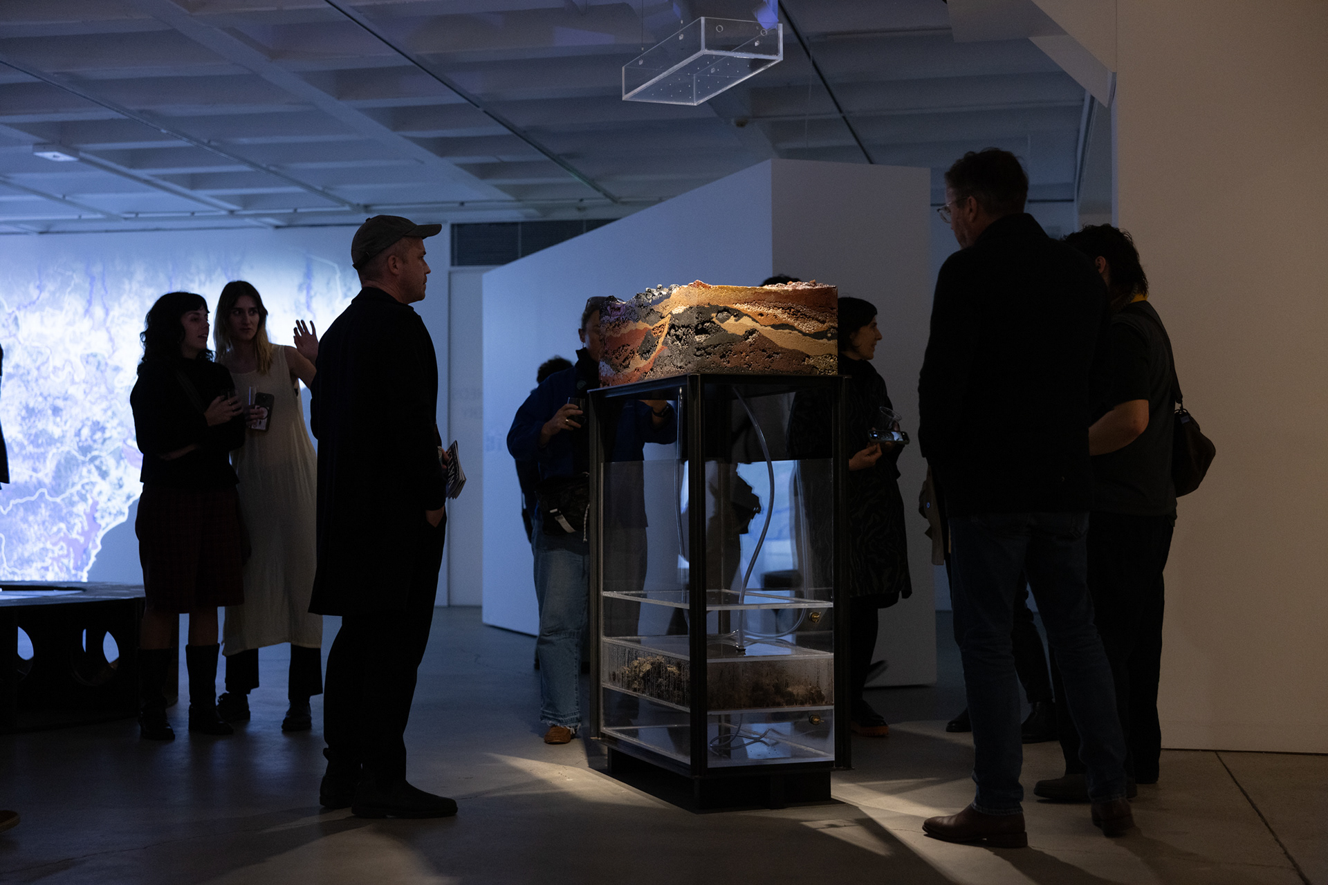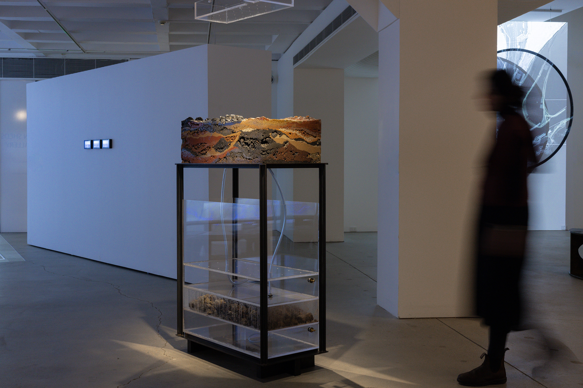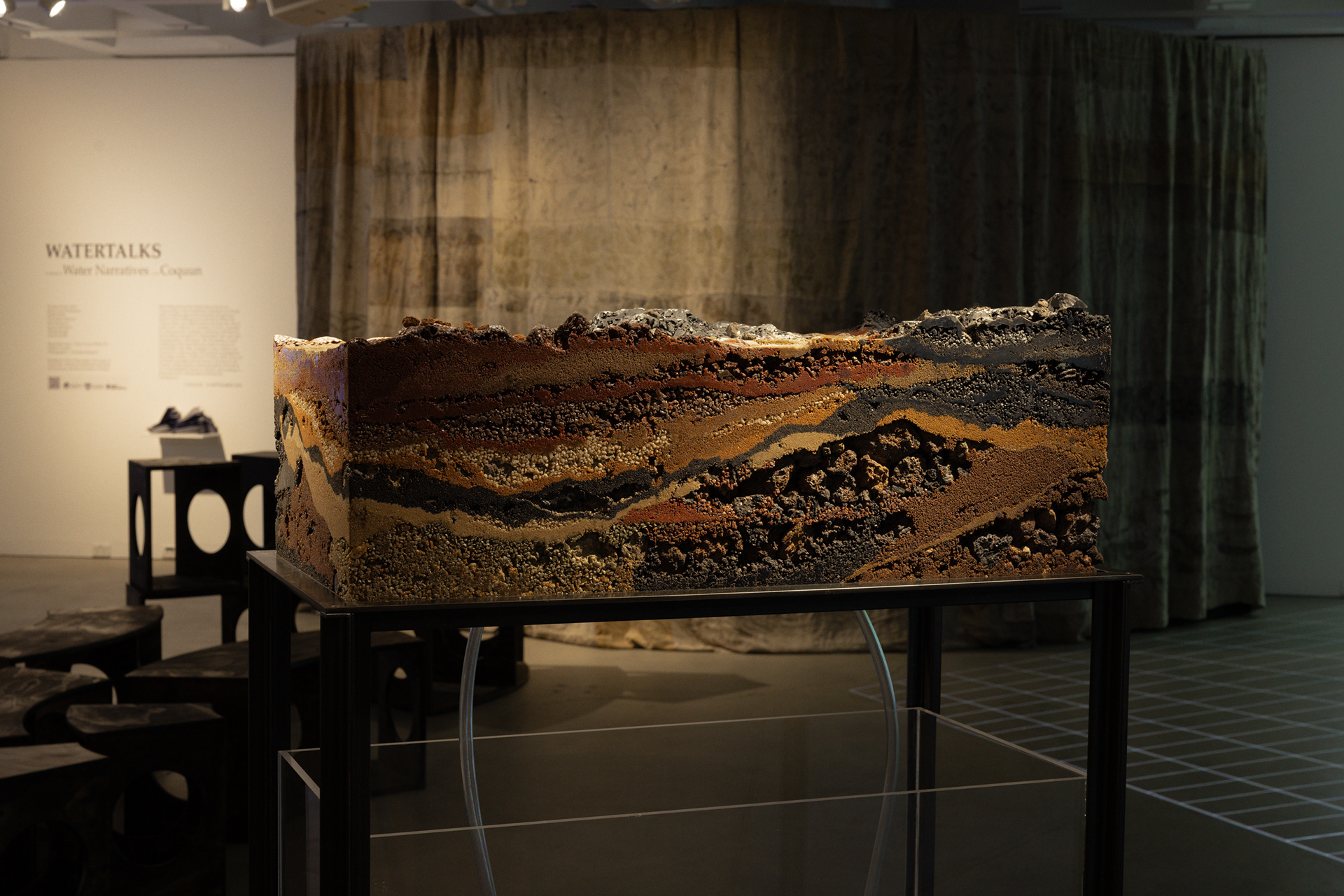 DeepWaters visualise the magnitude of the impact of colonial practices on land and waters. A stand-alone geological section cuts an urban settlement – Singleton Heights; two hydrological bodies – the Hunter River, and one of its tributaries, the Wollombi Broo; and three mine sites – Mount Thorley – Warkworth, United-Project – BHP, and Rixs Creek – The Bloomfield Group, demonstrating the imbalances caused by human inhabitation, industrial and agricultural bounds on Country. To interpret the River’s eras, layers of sand, aggregate, subsoil, and water are encased in anthropogenic materials – disrupted soils and rocks and petrochemical subproducts, framed in mild steel produced in the Hunter.