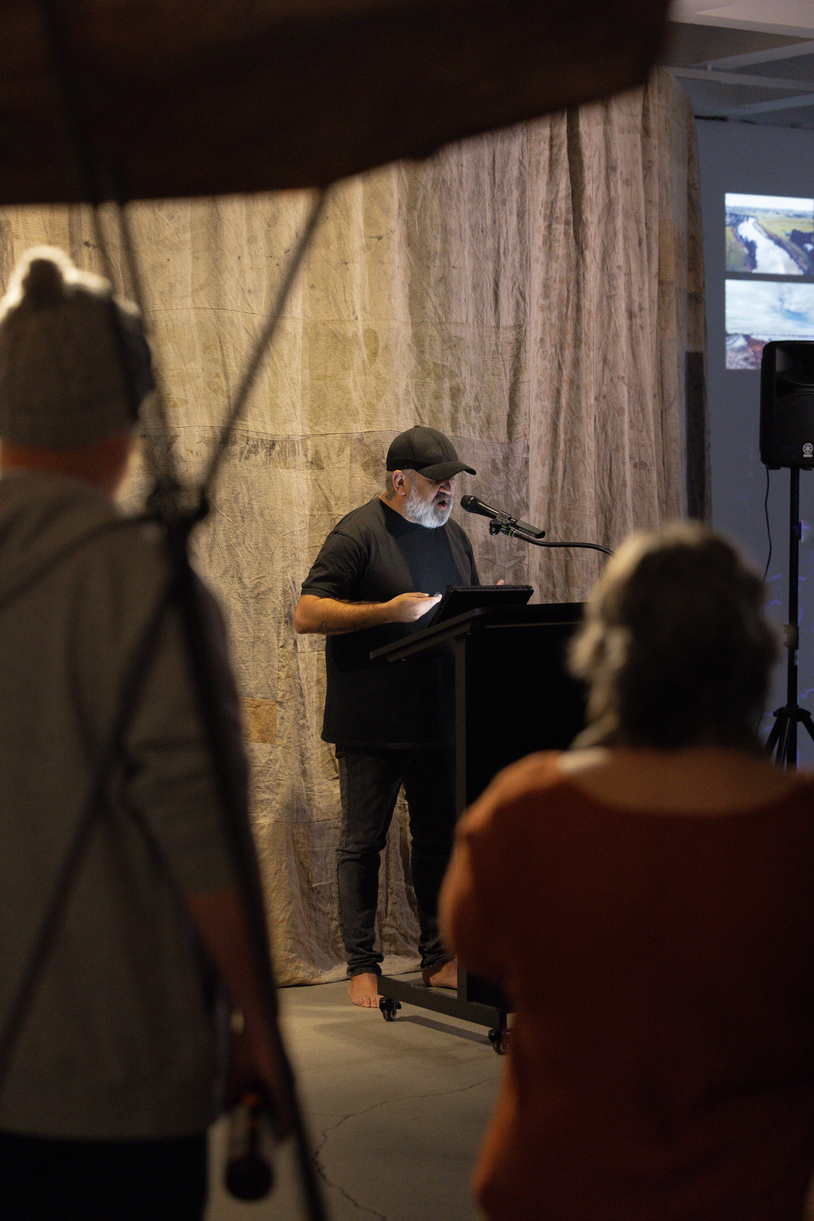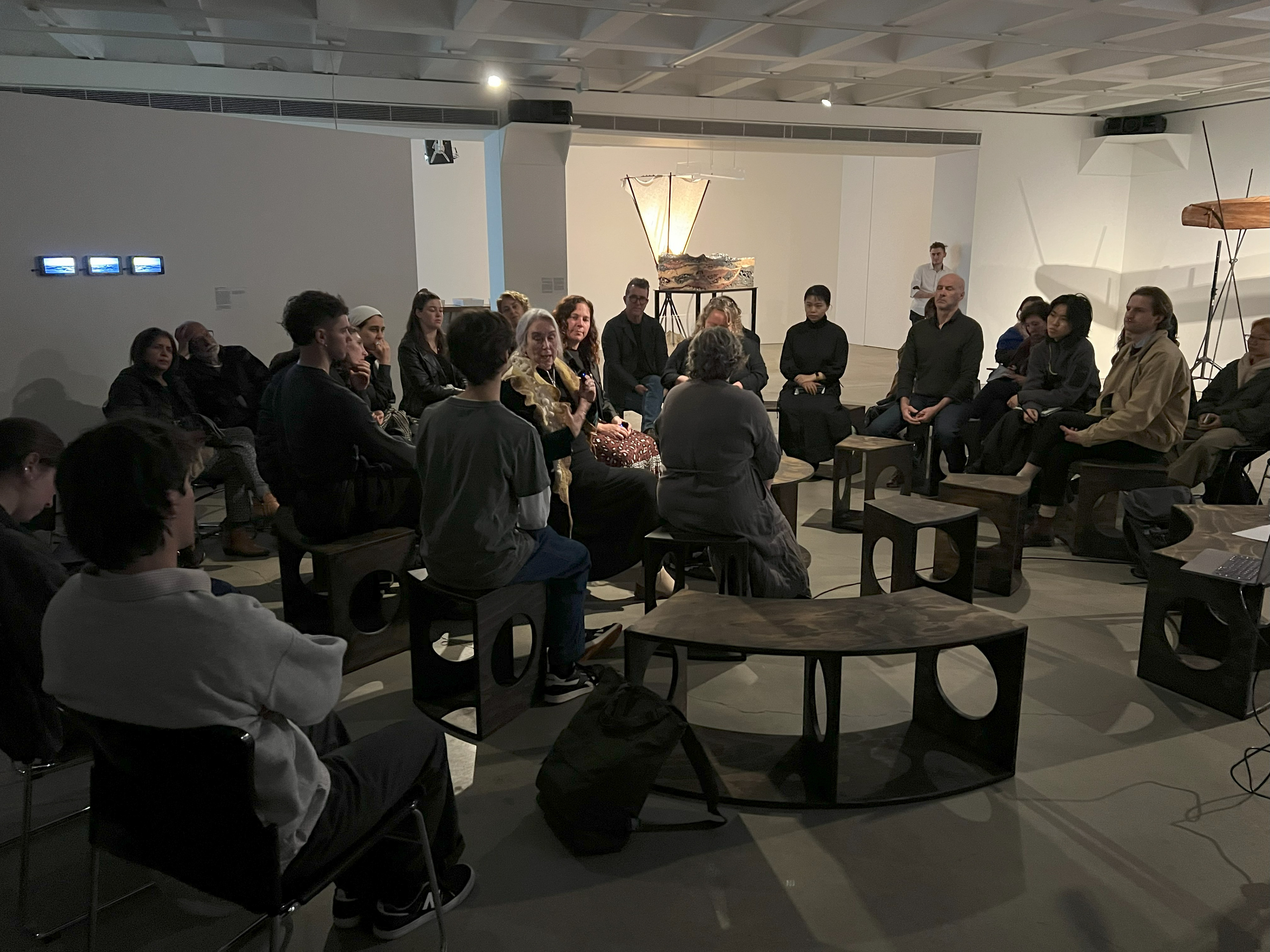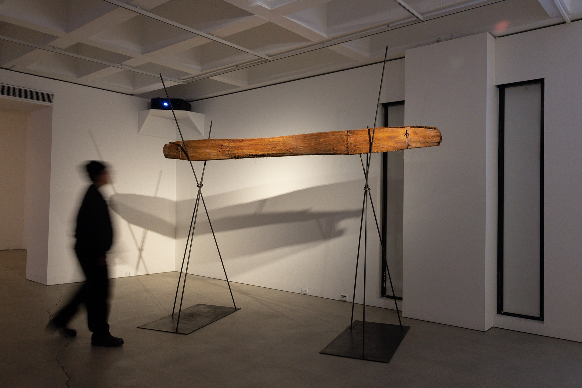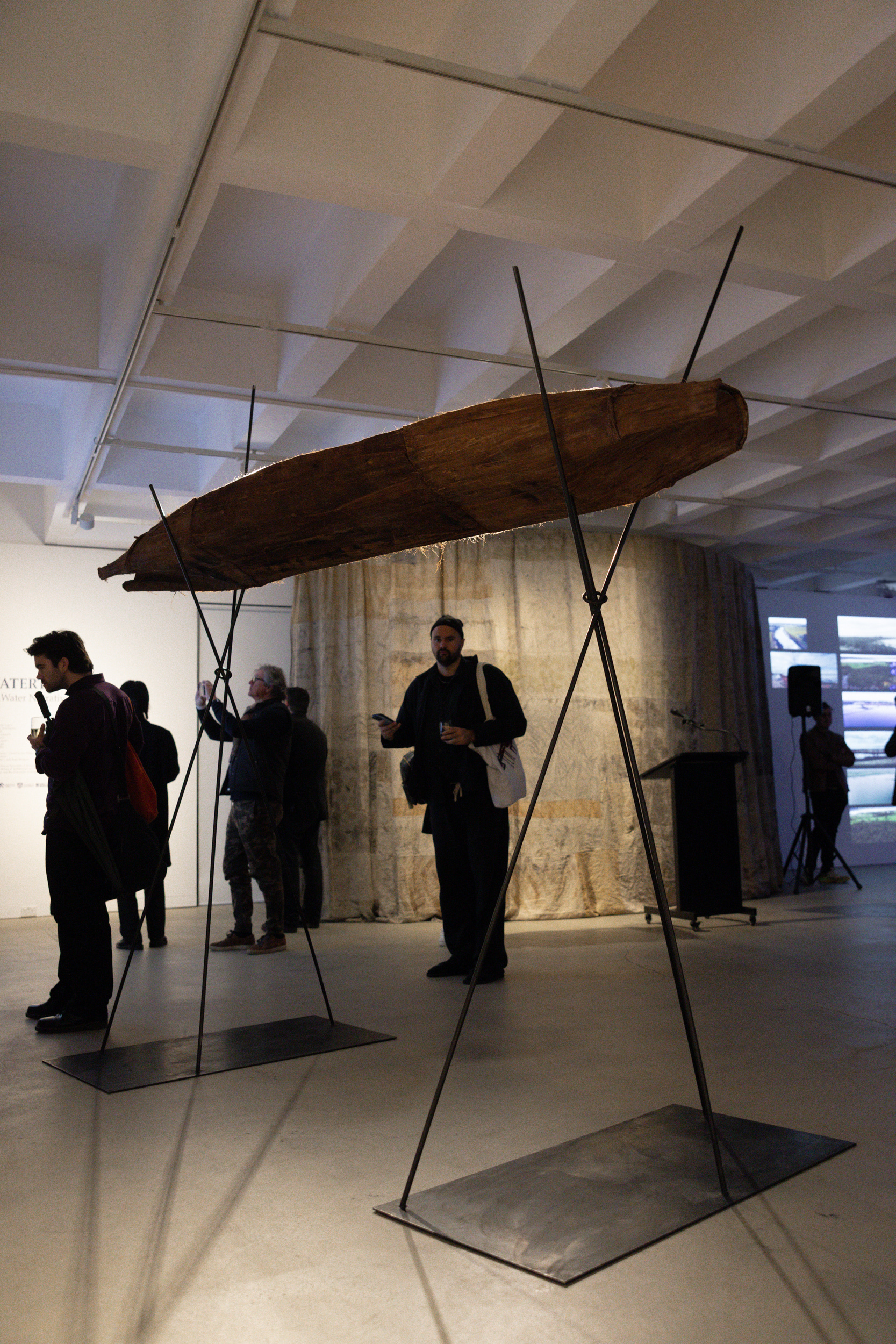 This work emerges from the reassembly of a previously dismembered canoe form, speaking to a wider act of cultural reawakening. Realised in collaboration with sculptor Julie Squires and led by Worimi man Luke Russell—together with the guidance and labour of many others—the canoe is now elevated on slender stands that evoke rushes, reeds, and spears. In this configuration, the viewer’s gaze shifts from that of the occupant to that of the river: we look up from below, as though the water itself is watching. This inversion recentres a more-than-human perspective, reminding us that Country is not only seen by us—it sees, feels, and holds us.