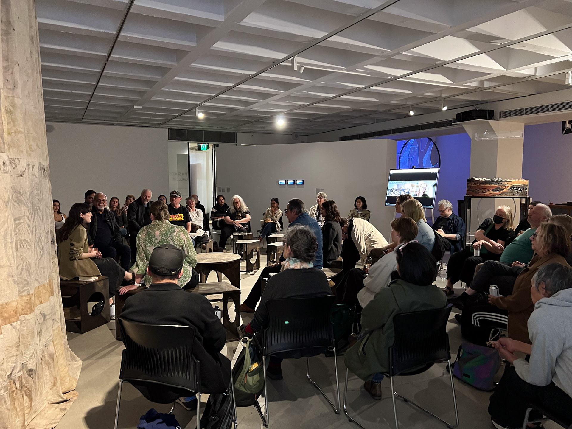 brings together D’harawal, Dharug, Awabakal, Biripi, Balanggarra and Ngiyampaa Wangaaypuwan artists and practitioners to interweave water knowledge about the Burramattagal–Parramatta, Dyarubbin–Hawkesbury, Coquun–Hunter, and Boolumbahtee–Manning rivers.